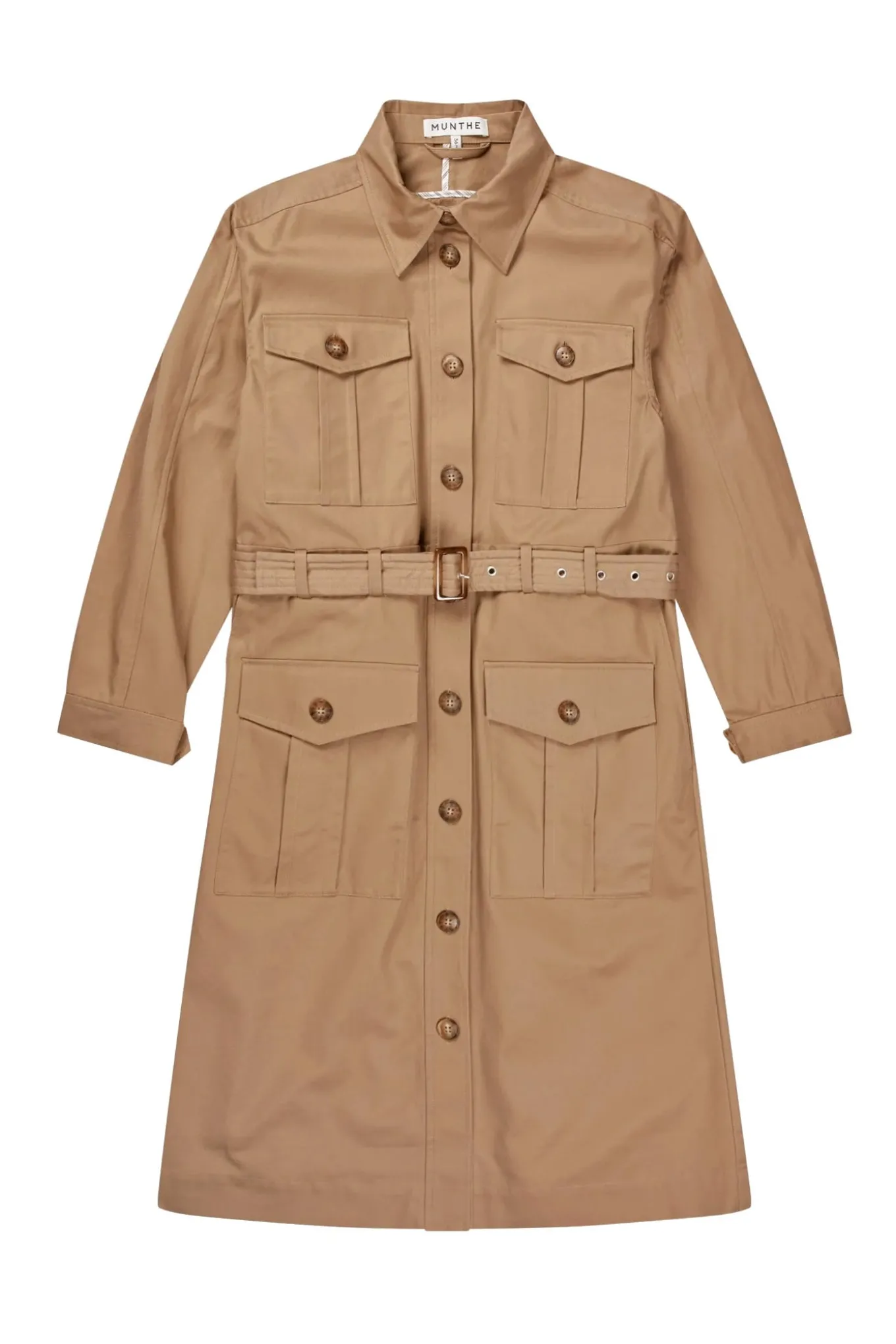 Stilfuld trench-inspireret kjole i klassisk camel med skræddersyet skjortekrave, gennemgående knaplukning og praktiske lommer med utility-look. Afsluttet med et matchende bælte, der fremhæver taljen for et alsidigt udtryk.