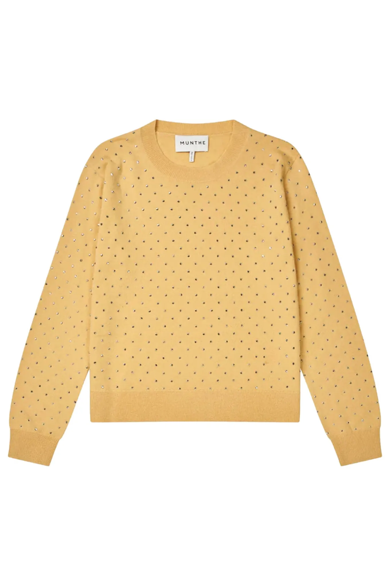 Smuk, blød striktrøje med elegante sølvfarvede nitter. Strikken har en klassisk rund halsudskæring og lange ærmer med ribkanter.