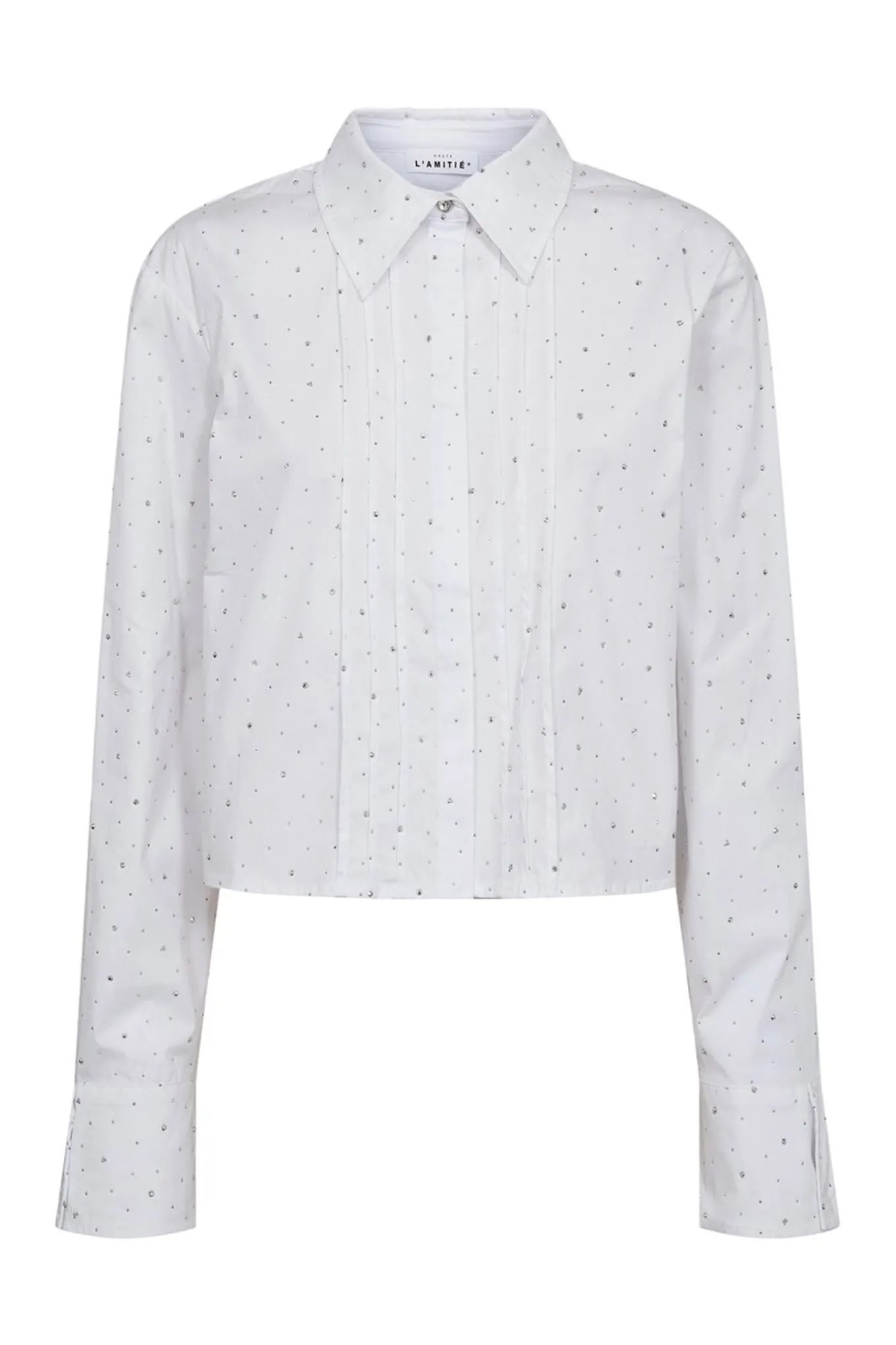 Flot cropped skjorte fra Haute L’Amitié med lange ærmer, krave i halsen og skjult knaplukning langs fronten. Skjorten er også detaljeret med skønne små similisten.