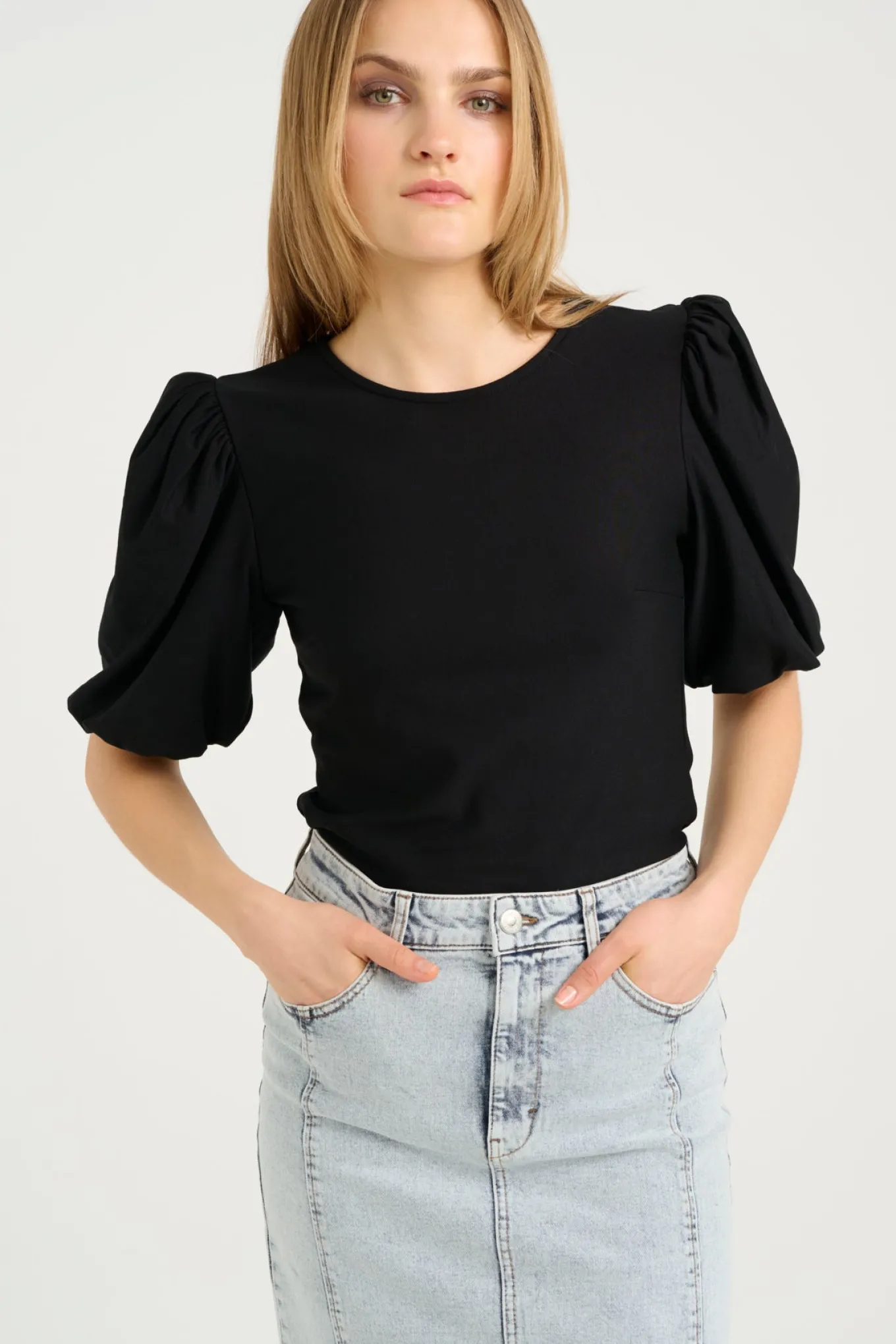 OBS! Fjernlager. Levering kan blive forlænget med 2-3 dage, hvis varen ikke findes i vores butik lige nu.Sød bluse fra Gestuz med ½ lange pufærmer, rund hals og en let figursyet silhuet.