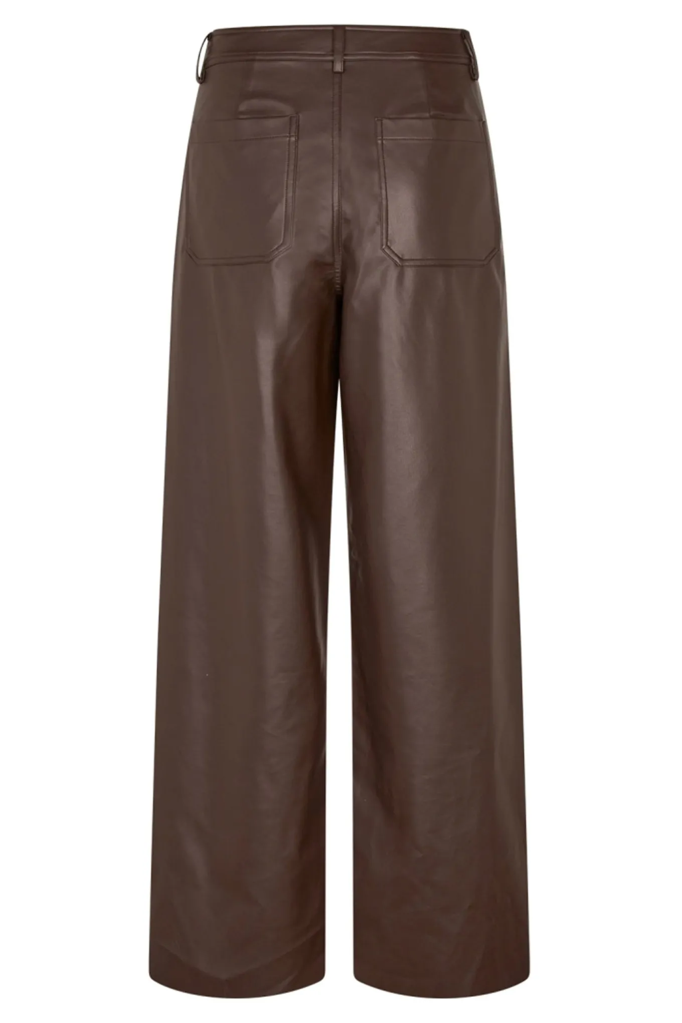 Cool og moderne bukser fra Lollys Laundry i blødt kunstlæder. De har brede ben og en flatterende høj talje med bæltestropper. De to store påsyede lommer foran tilføjer et dristigt, retro-inspireret touch til looket.