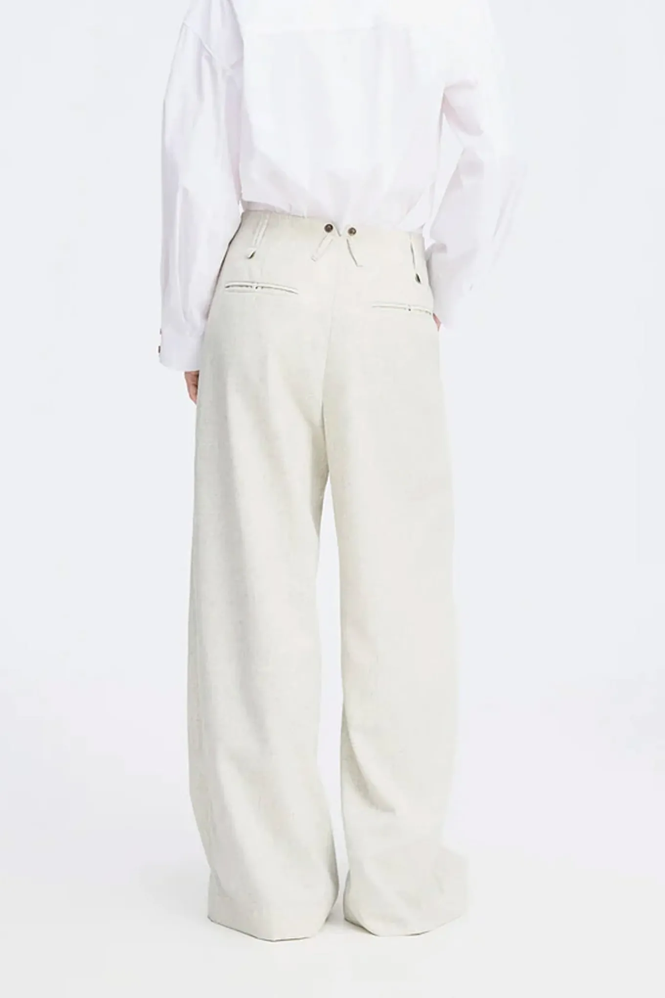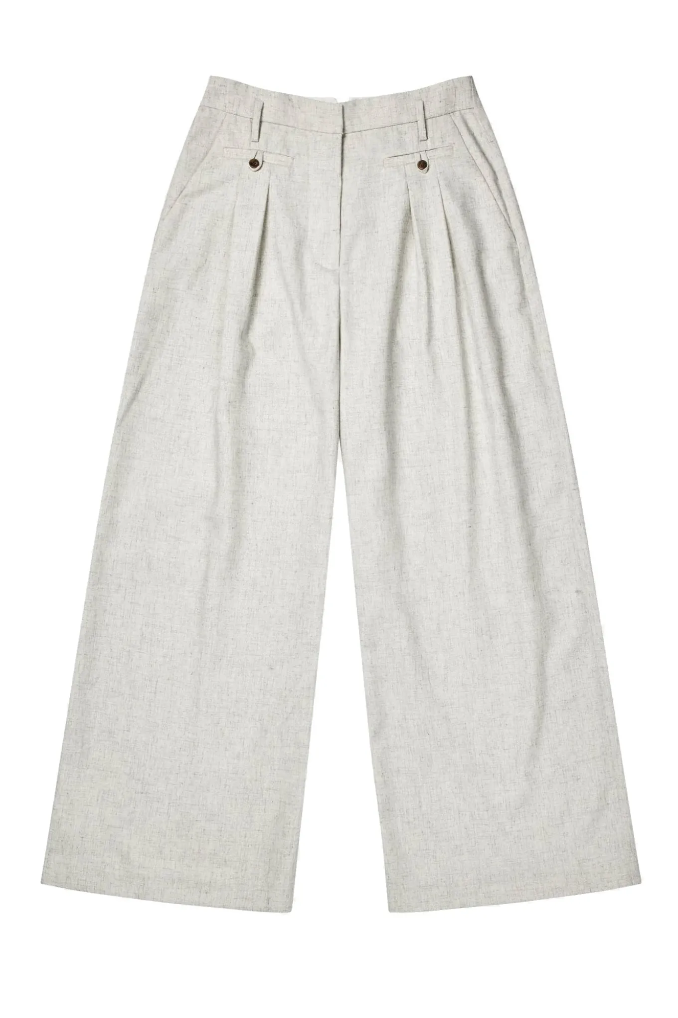 Elegante, lyse bukser i en strukturvævet kvalitet med brede ben. Designet med høj talje, pressefolder, skrålommer og paspolerede baglommer med knap.