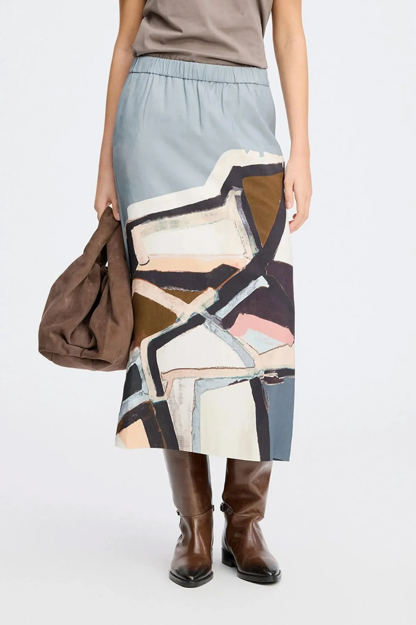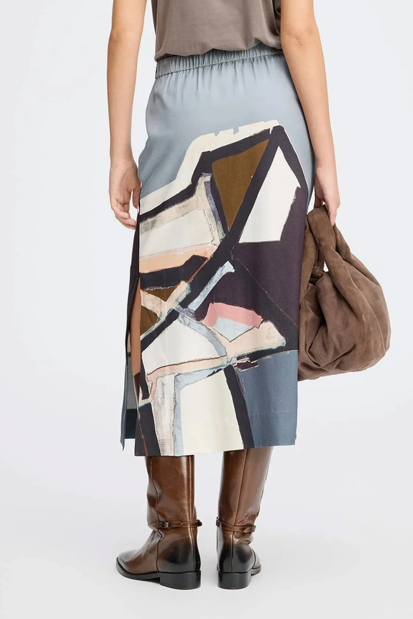 Smuk nederdel med et elegant abstrakt grafisk print. Nederdelen er designet med en elastisk talje, en slids og elegante lommer i siden.
