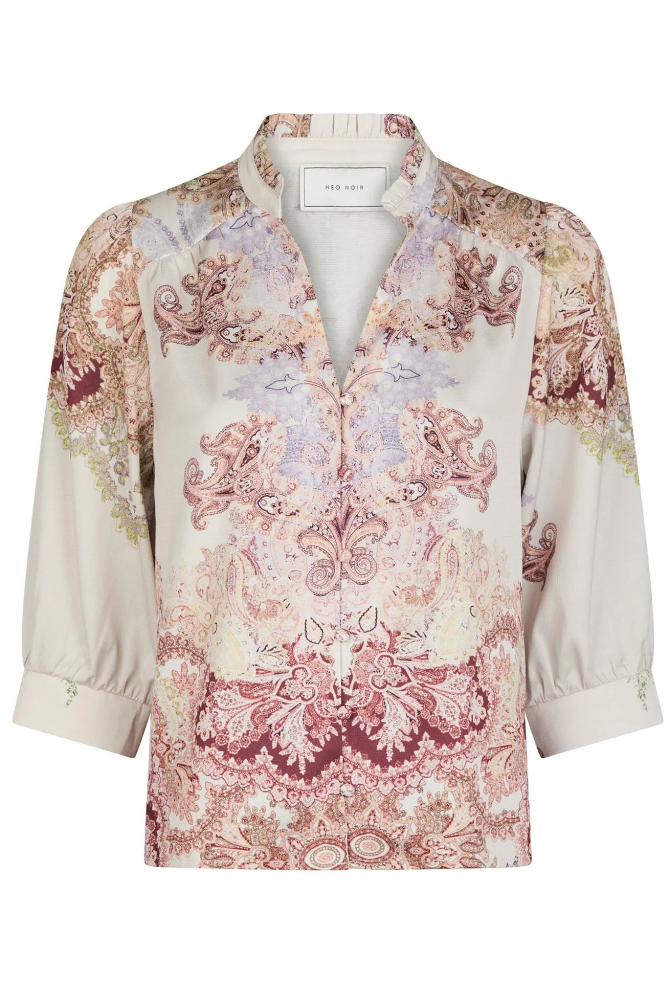 OBS! Fjernlager. Levering kan blive forlænget med 2-3 dage, hvis varen ikke findes i vores butik lige nu.Elegant og feminin bluse fra Neo Noir med ¾ lange ærmer, kinakrave med v-udskæring i halsen og et smukt paisley print.