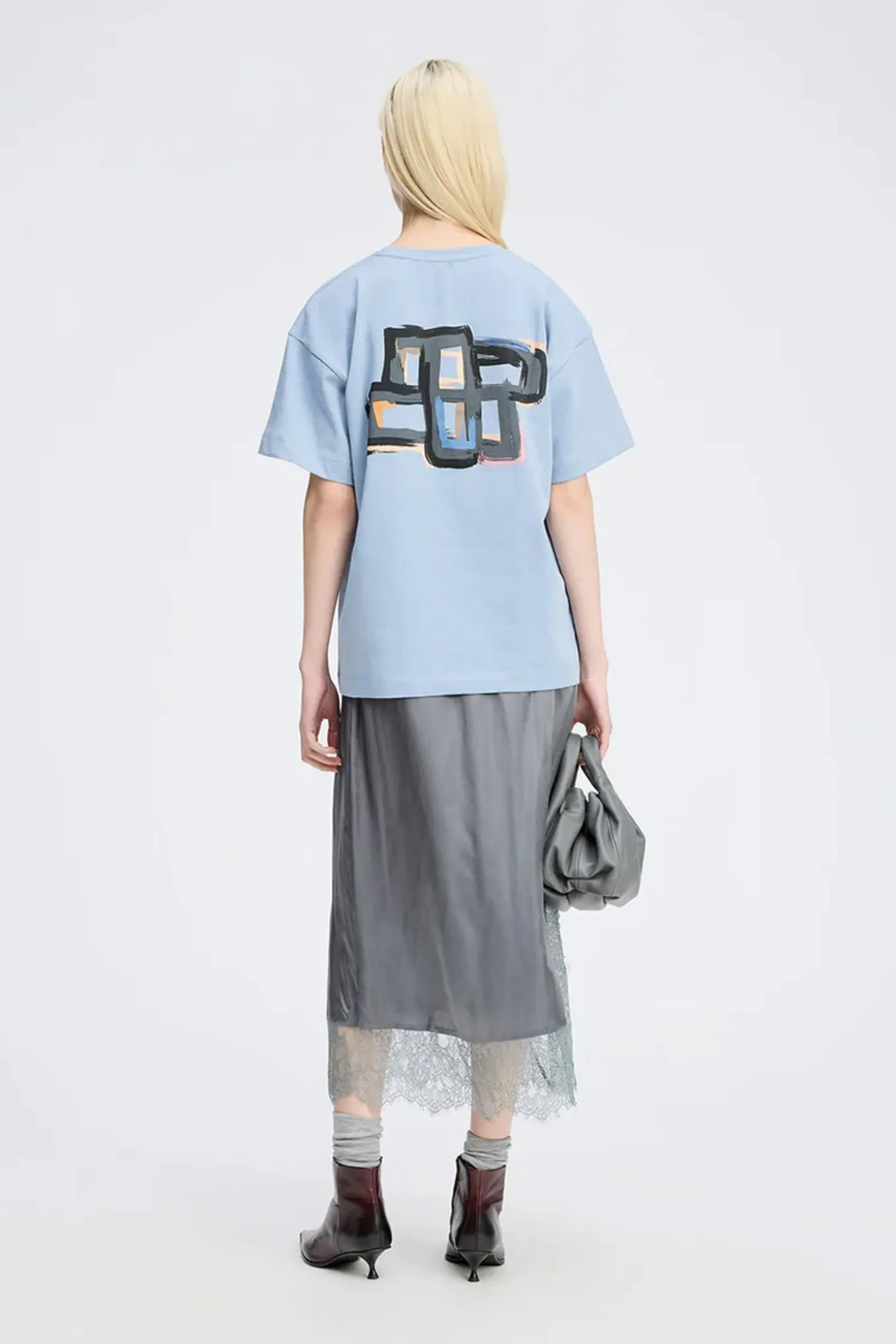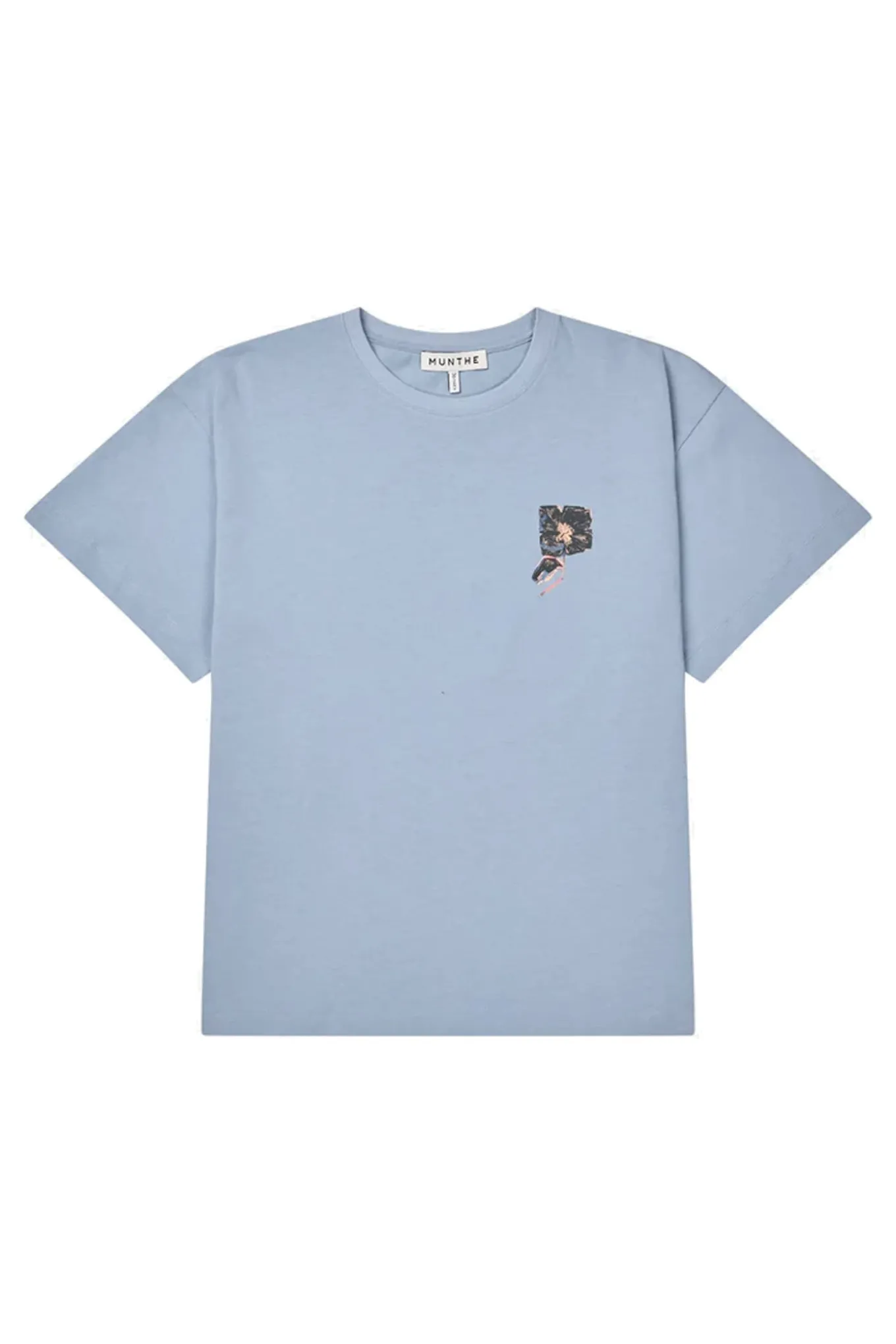 Elegant T-shirt med et lille kunstnerisk blomsterprint på fronten og et smukt grafisk MUNTHE-emblem på ryggen. T-shirten har en løs pasform, korte ærmer og en rund halsudskæring.