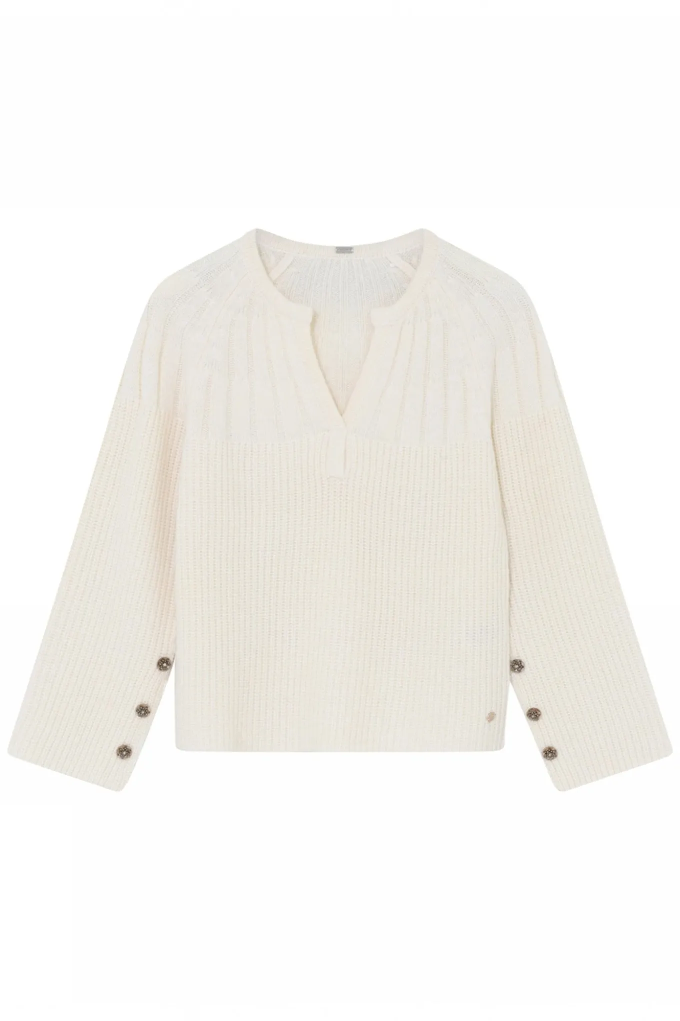 OBS! Fjernlager. Levering kan blive forlænget med 2-3 dage, hvis varen ikke findes i vores butik lige nu.Lækker strik fra Gustav med lange ærmer, rund hals med v-udskæring og fine knapdetaljer i bunden af ærmerne.