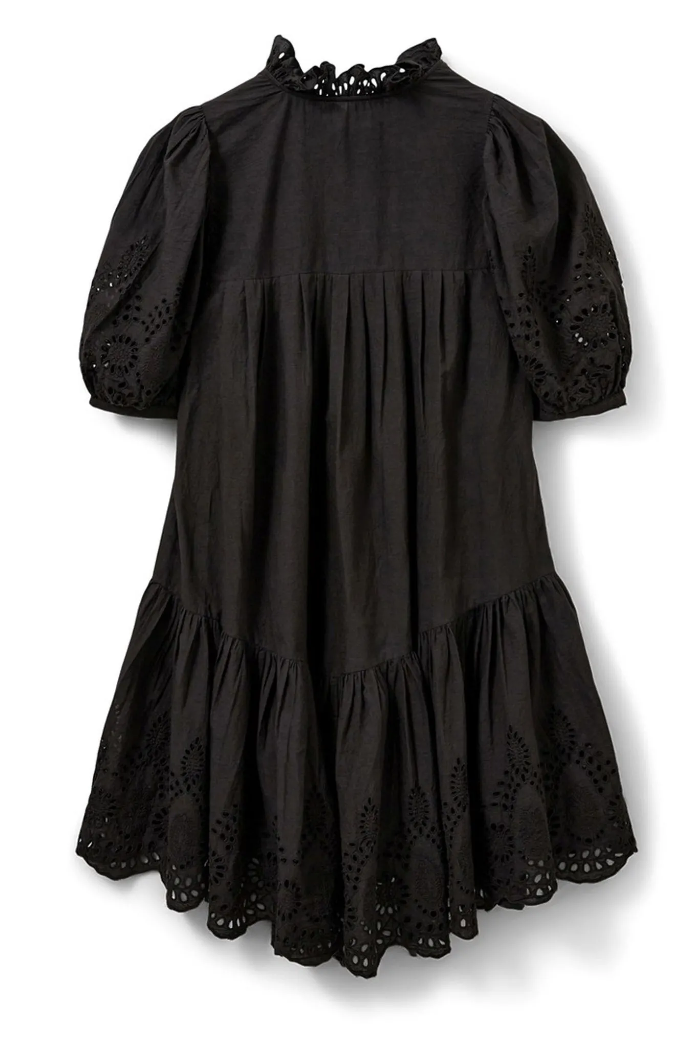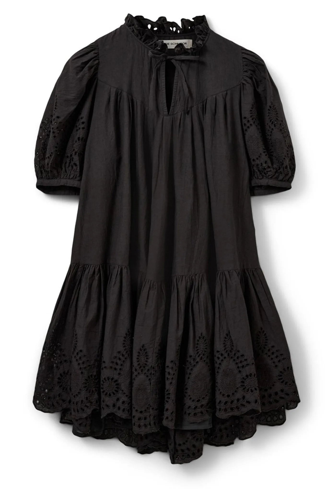 - OBS! Fjernlager. Levering kan blive forlænget med 2-3 dage, hvis varen ikke findes i vores butik lige nu.Feminin kjole fra Sofie Schnoor med ½ lange pufærmer, rund hals med v-udskæring og smukke broderet detaljer i bunden.