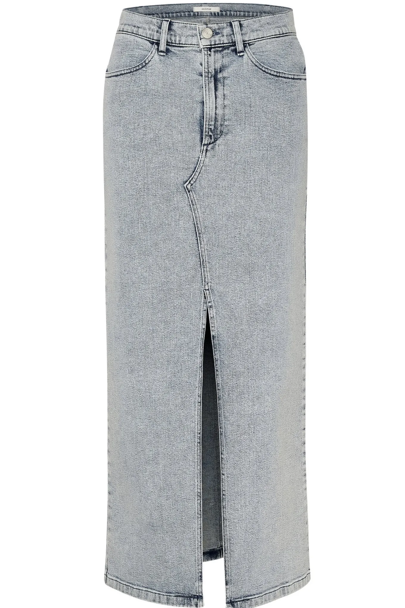 OBS! Fjernlager. Levering kan blive forlænget med 2-3 dage, hvis varen ikke findes i vores butik lige nu.Cool denim nederdel fra Gestuz med høj talje, klassiske lommer og en smart slids i fronten.