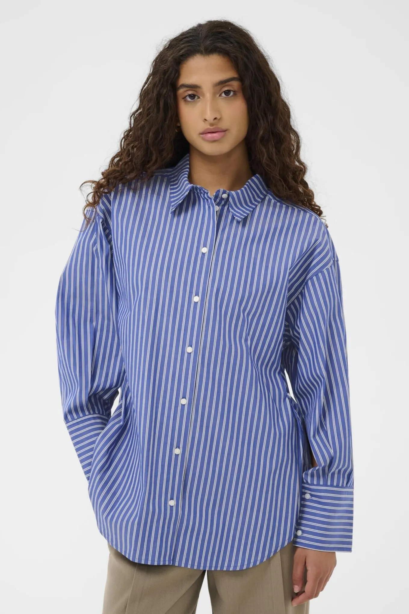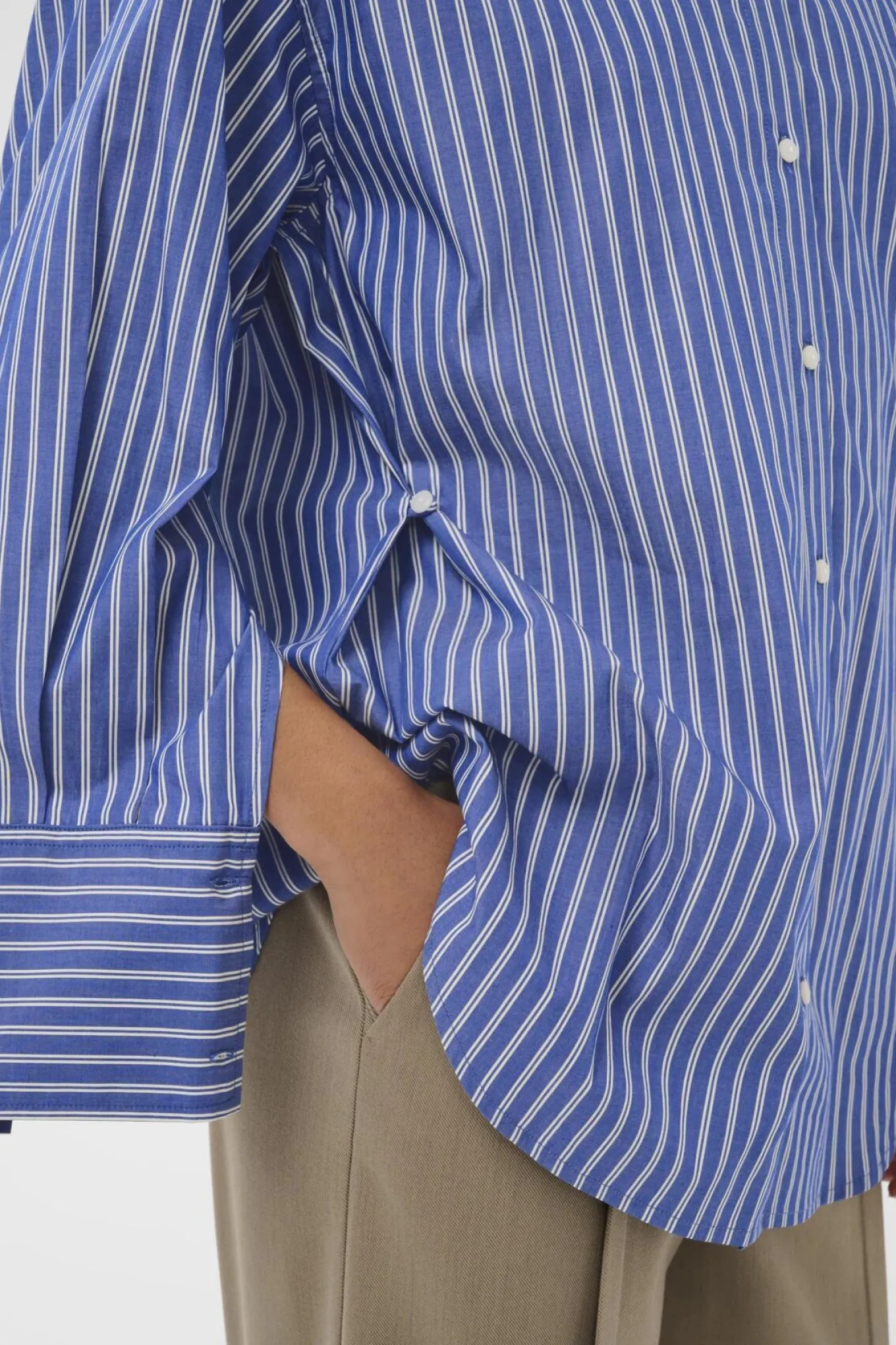 Denne smukke skjorte i Nouvean Navy Stripe farver er lavet af 100% bomuld og er perfekt til enhver lejlighed. Fra Soaked in Luxury.