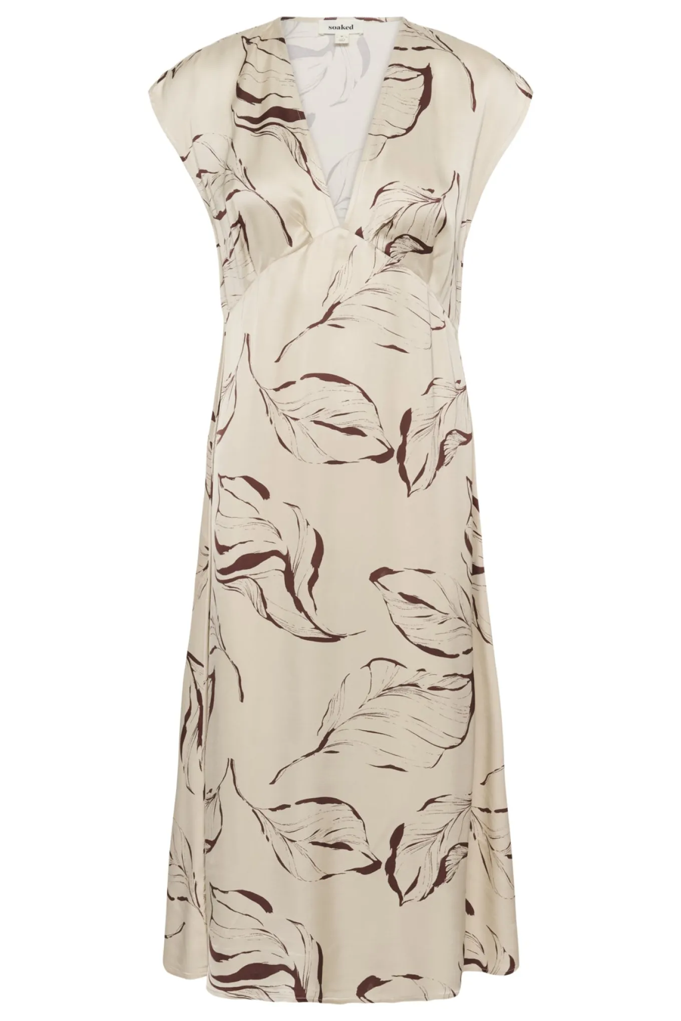 Denne skønne kjole fra Soaked in Luxury er det perfekte valg til en afslappet og chic stil. Kjolen er i farven Oatmeal Leave Print og lavet af 50% viscose og 50% LENZI viscose.
