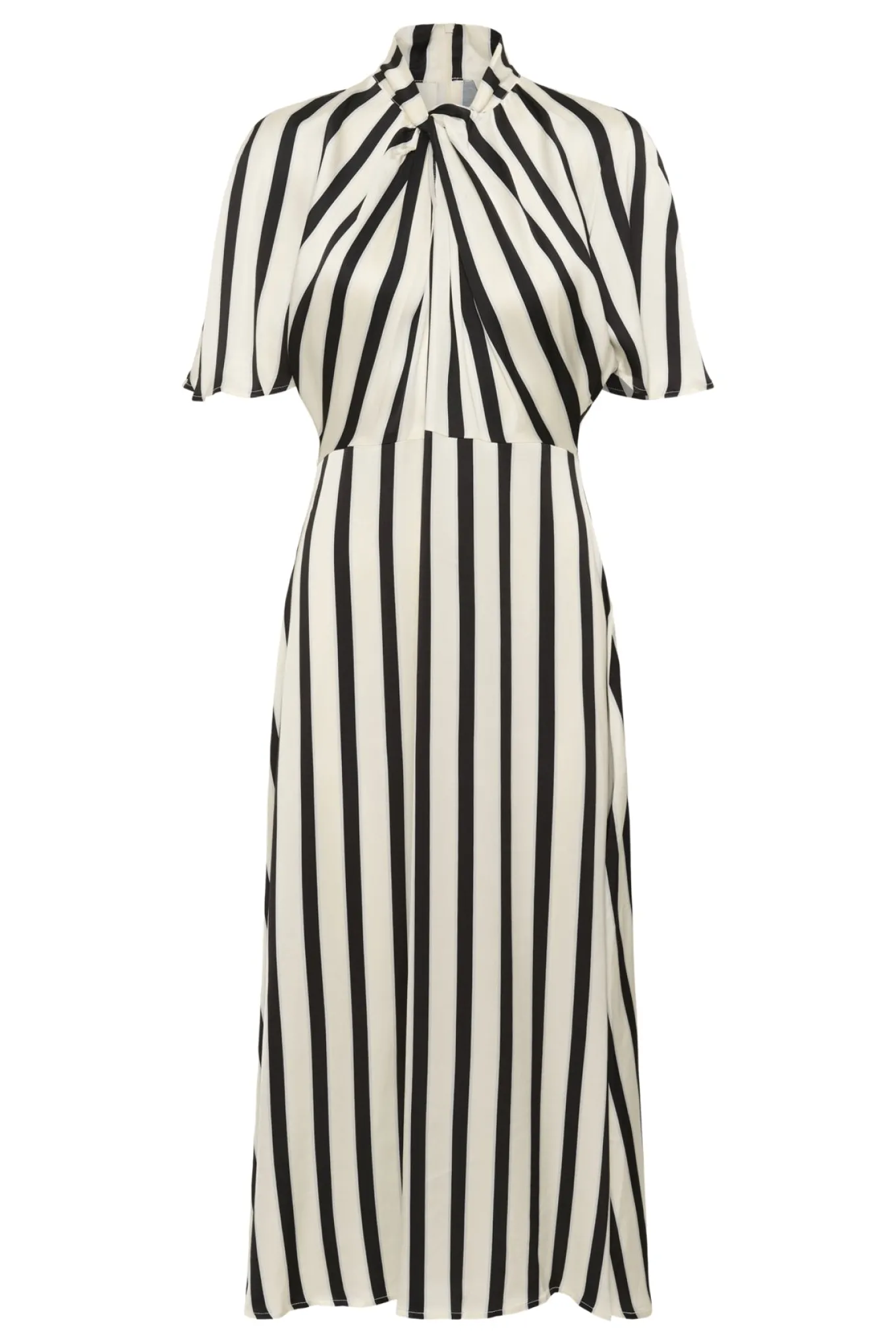 OBS! Fjernlager. Levering kan blive forlænget med 2-3 dage, hvis varen ikke findes i vores butik lige nu.Smuk kjole fra Soaked In Luxury med ½ lange ærmer, høj hals med en flot draperet effekt over brystet samt et feminint snit og klassiske striber .