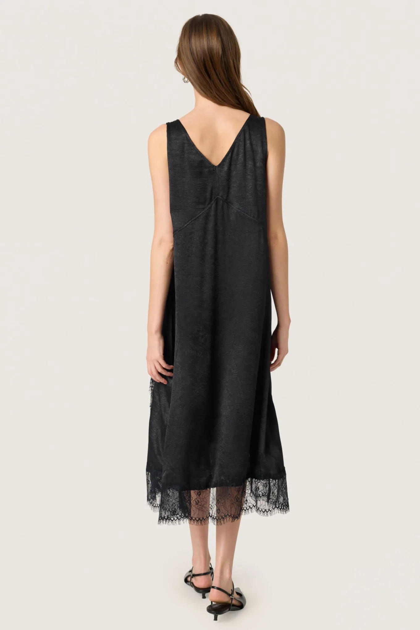 OBS! Fjernlager. Levering kan blive forlænget med 2-3 dage, hvis varen ikke findes i vores butik lige nu.Elegant kjole fra Soaked In Luxury med v-udskæring i halsen, en smuk blank kvalitet og super fine blondekanter i bunden.Kjolen har også et afslappet snit og slids i siden.