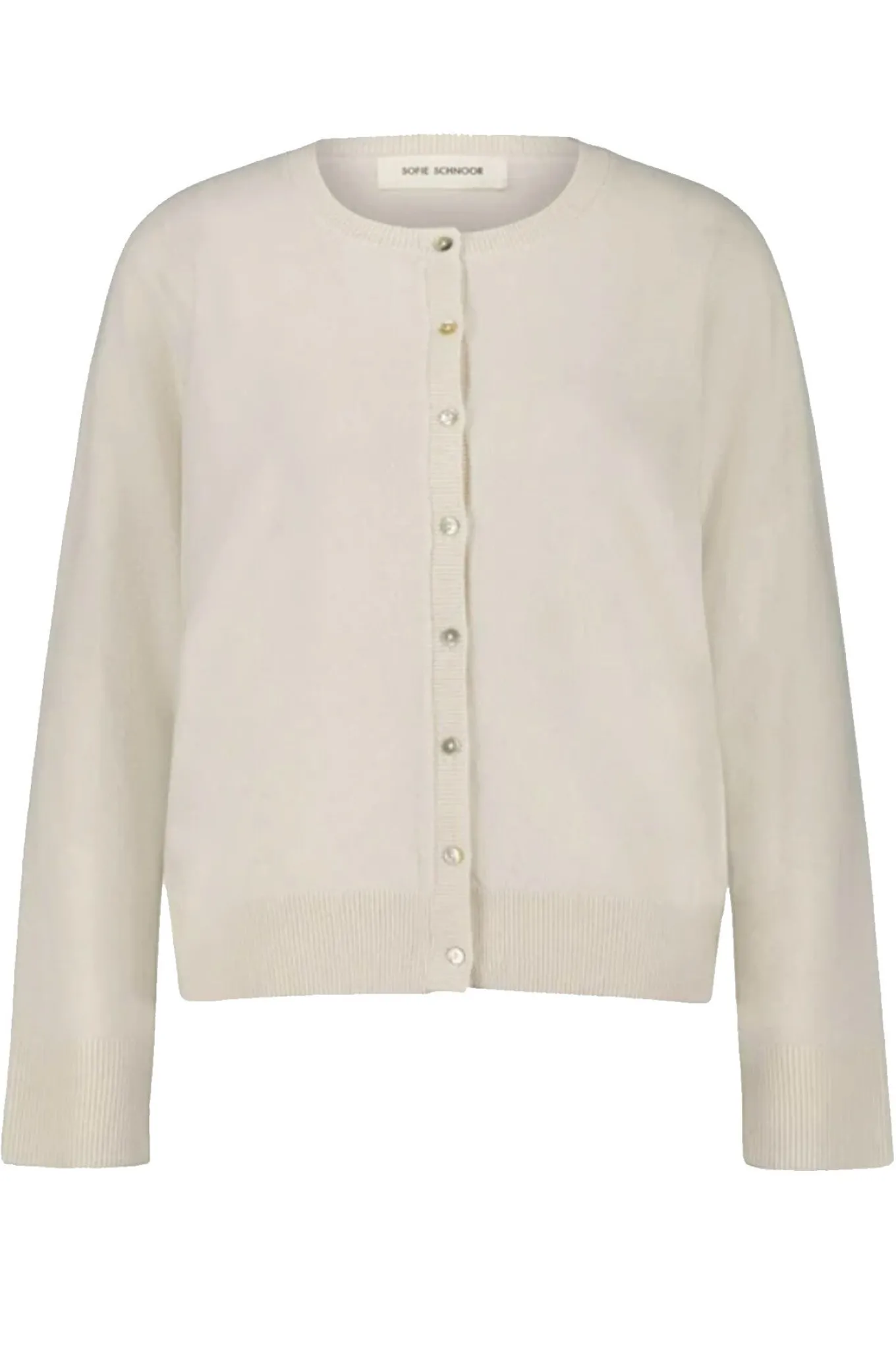 Feminin cardigan fra Sofie Schnoor med lange ærmer, rund hals og fine knapper langs fronten.