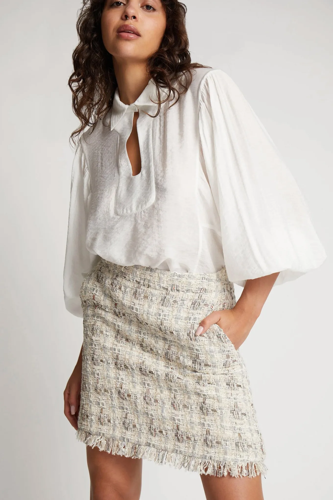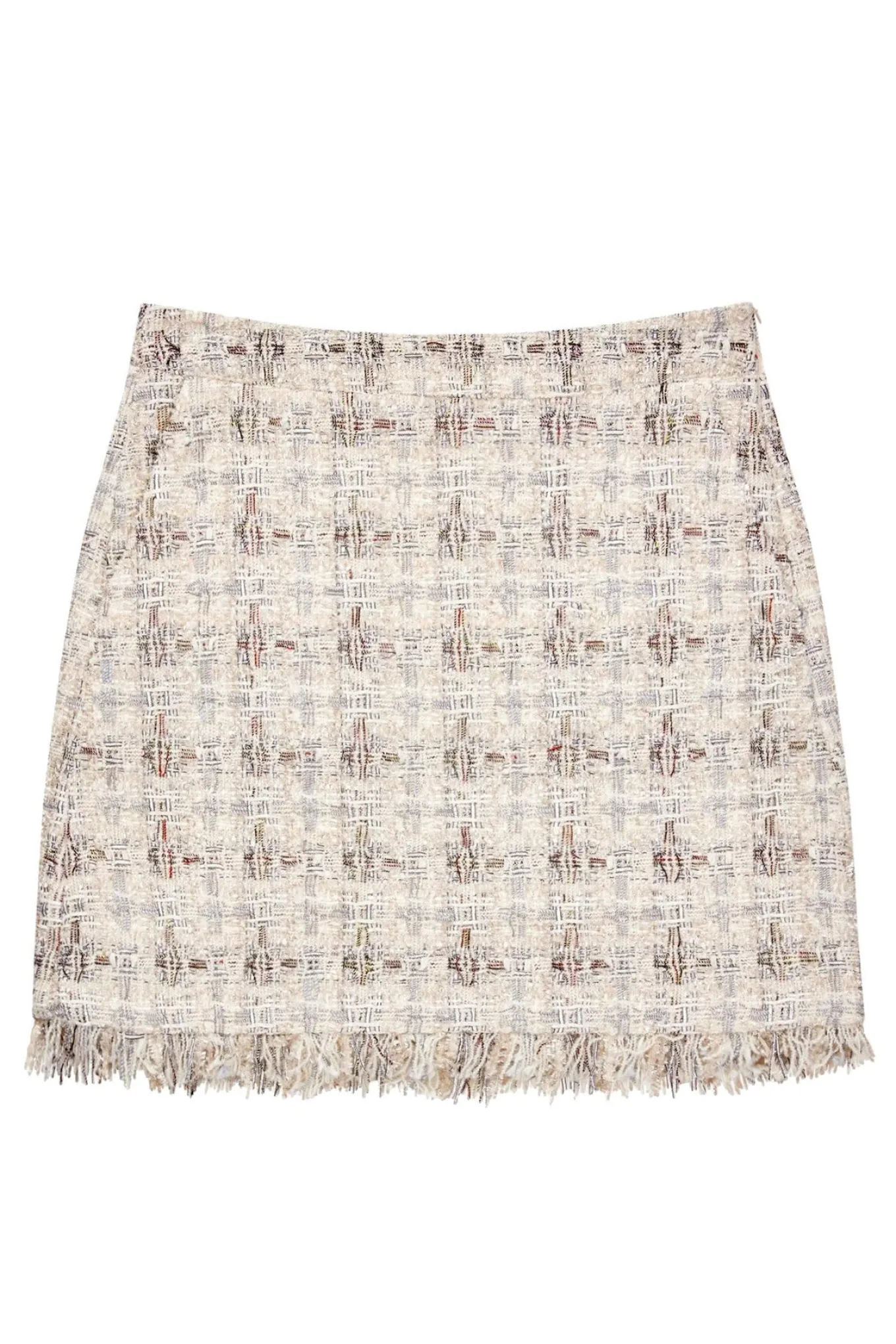 OBS! Fjernlager. Levering kan blive forlænget med 2-3 dage, hvis varen ikke findes i vores butik lige nu.En kort bouclé nederdel fra Munthe designet med små frynser og et elegant mønster med struktur og diskrete farver.