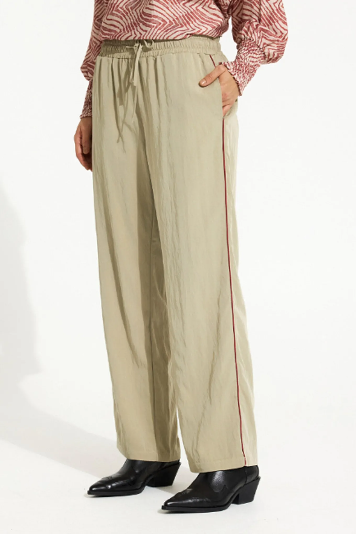 - OBS! Fjernlager. Levering kan blive forlænget med 2-3 dage, hvis varen ikke findes i vores butik lige nu.Smarte bukser fra In Front med lidt vidde i benene, en bred elastikkant og bindesnor i taljen samt en sporty stribe langs siden af benet.