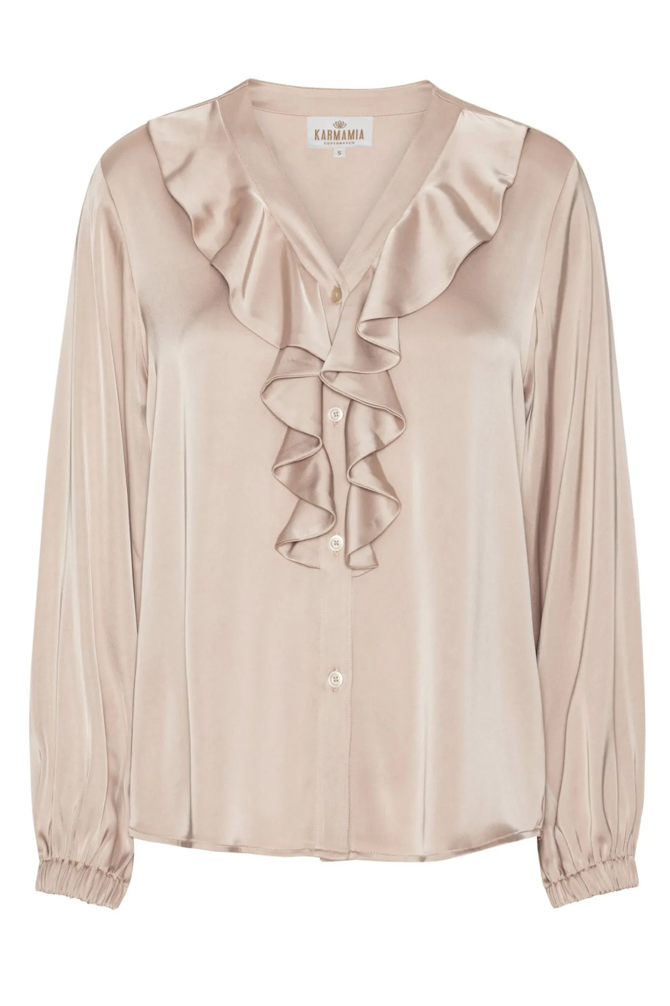 OBS! Fjernlager. Levering kan blive forlænget med 2-3 dage, hvis varen ikke findes i vores butik lige nu.Elegant bluse fra Karmamia med lange ærmer, v-udskæring i halsen og de smukkeste flæser over brystet.Blusen har også knaplukning langs fronten og den lækreste kvalitet.
