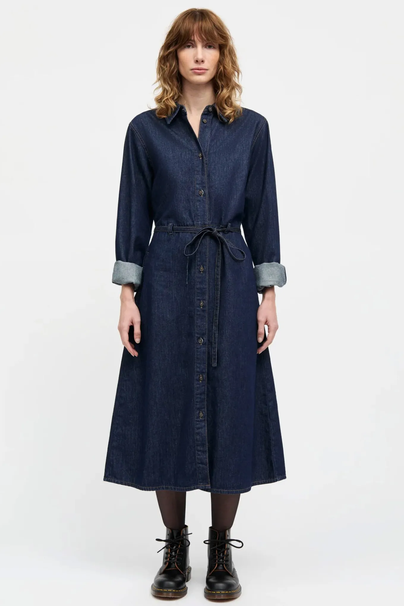 OBS! Fjernlager. Levering kan blive forlænget med 2-3 dage, hvis varen ikke findes i vores butik lige nu.Super fin skjortekjole fra Mads Nørgaard med lange ærmer, et klassisk A-snit og krave i halsen.Kjolen har også et smalt bindebælte i taljen og knaplukning langs fronten.