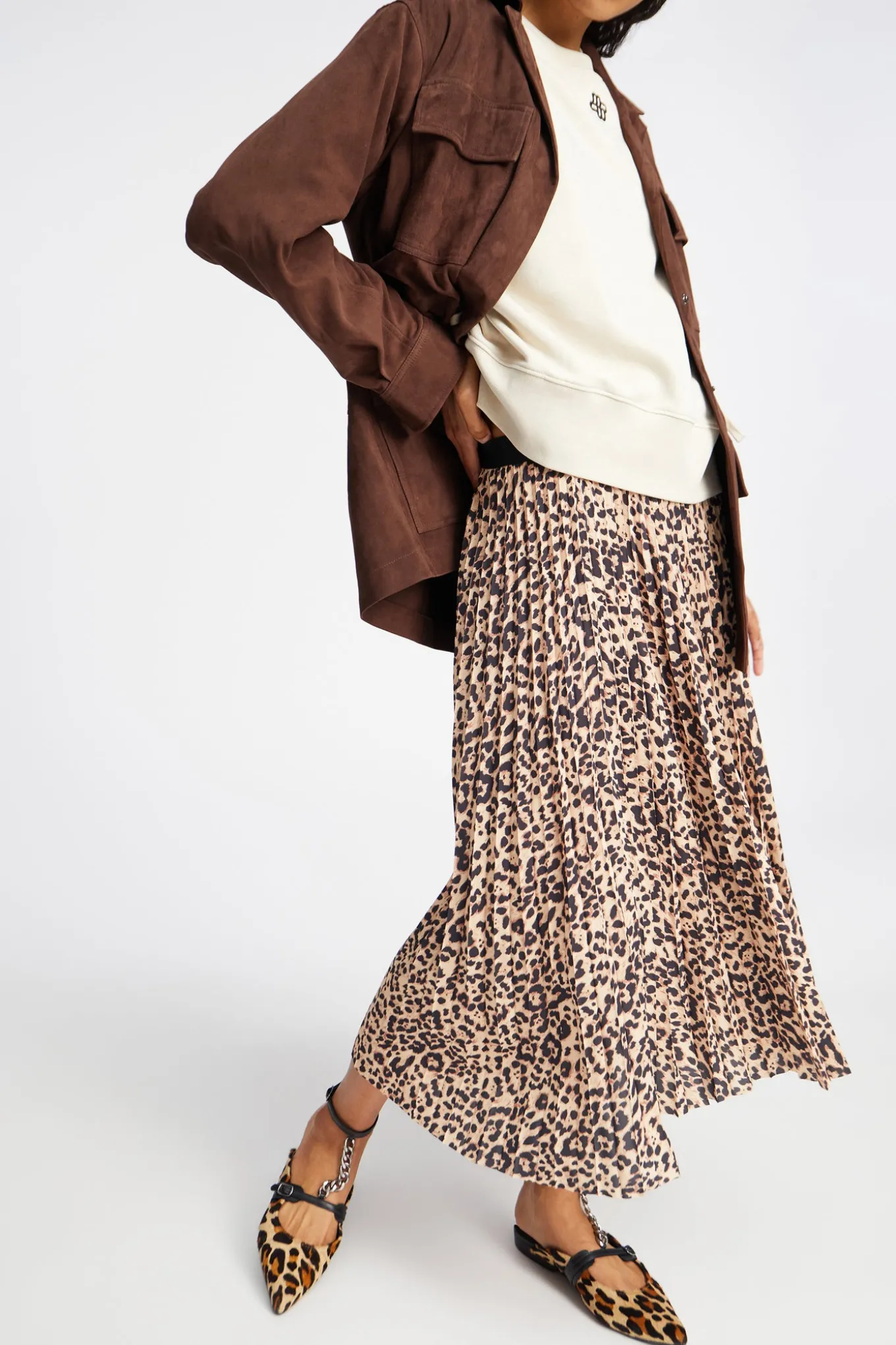 OBS! Fjernlager. Levering kan blive forlænget med 2-3 dage, hvis varen ikke findes i vores butik lige nu.Smuk plisseret nederdel fra Munthe med en bred elastikkant i taljen og et super fint leopardprint.