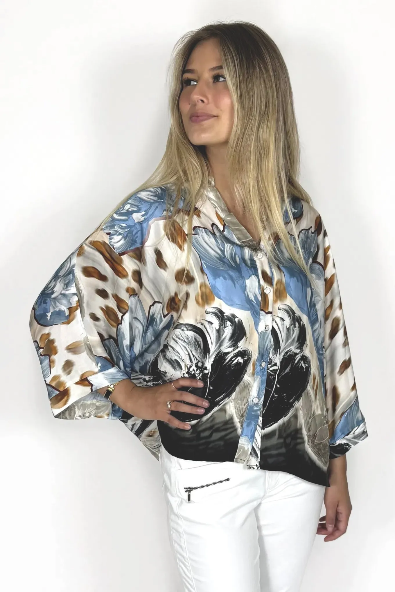 OBS! Fjernlager. Levering kan blive forlænget med 2-3 dage, hvis varen ikke findes i vores butik lige nu.Elegant skjorte fra 2-Biz med ¾ lange ærmer, rund hals med v-udskæring og smukke perleknapper langs fronten.