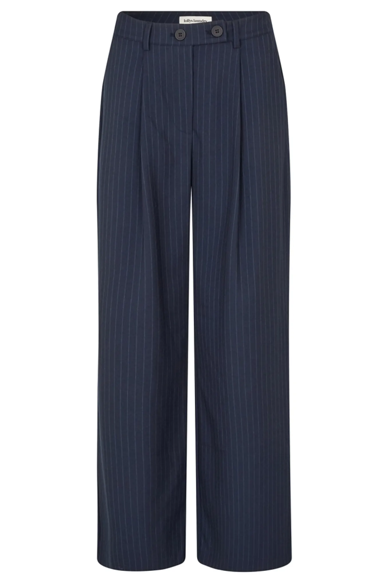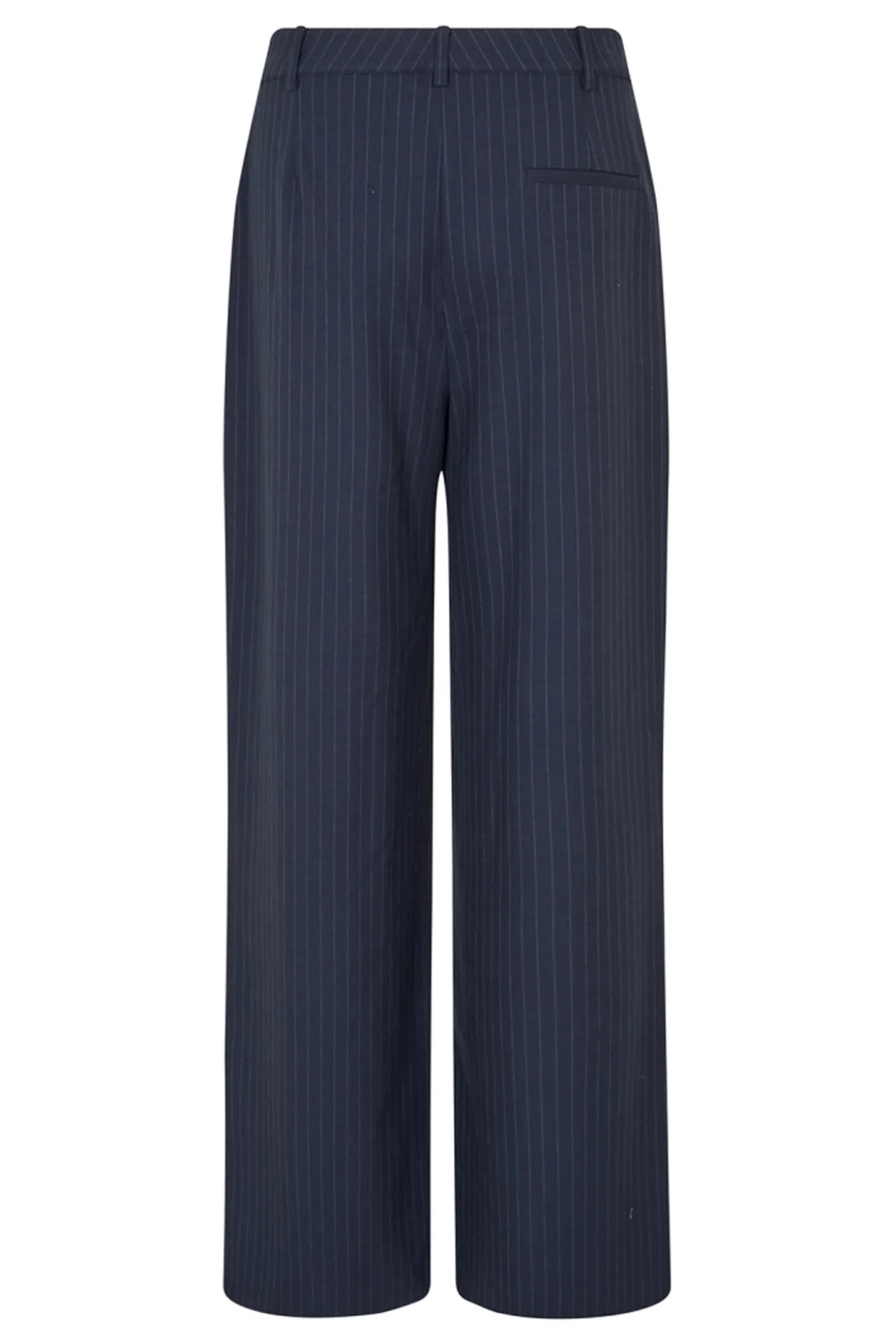 OBS! Fjernlager. Levering kan blive forlænget med 2-3 dage, hvis varen ikke findes i vores butik lige nu.Klassiske jakkesæt-inspirerede bukser med en flatterende og tidløs pasform. De er lavet i en mørk marineblå base med fine nålestriber, og de giver et elegant og sofistikeret look. De er designet med en høj talje, læg foran og brede ben, så de skaber en smuk silhuet.