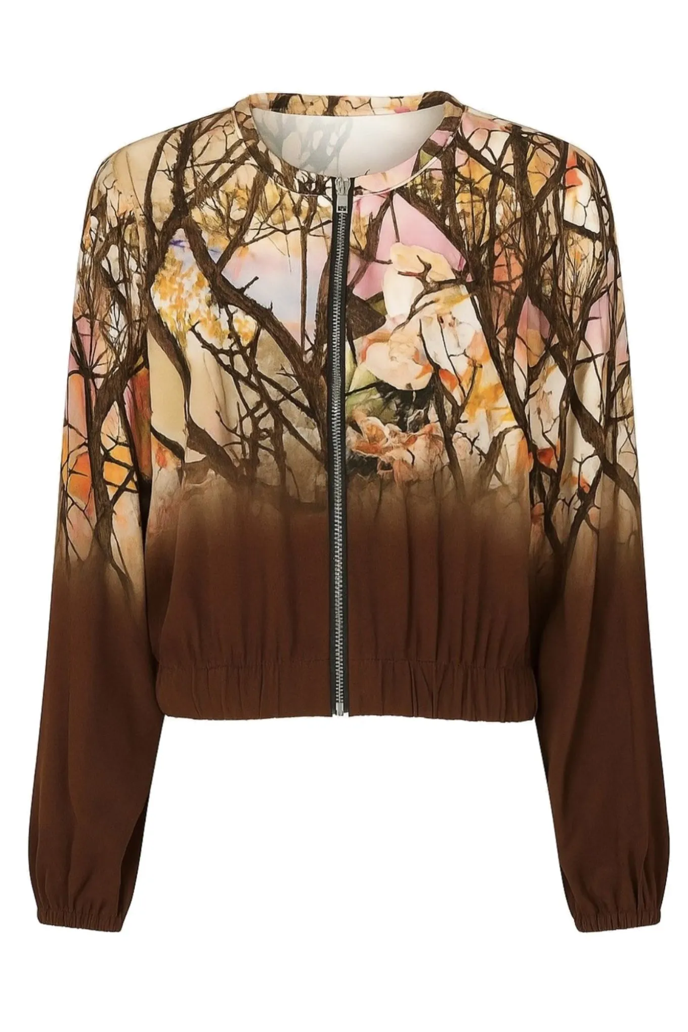 Skab et stilfuldt look med denne lette jakke fra 2-BIZ. Den korte jakke er lavet af blød viskose og prydet med et flot brunt bladprint.