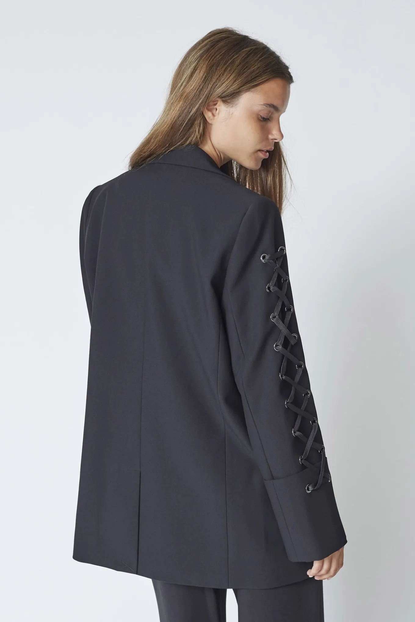 Denne elegante blazer i sort fra Co’couture er et must-have i enhver garderobe. Fremstillet med edgy eyelet detaljer der gør den til et cool statement piece, fra kontoret til en aften ude.